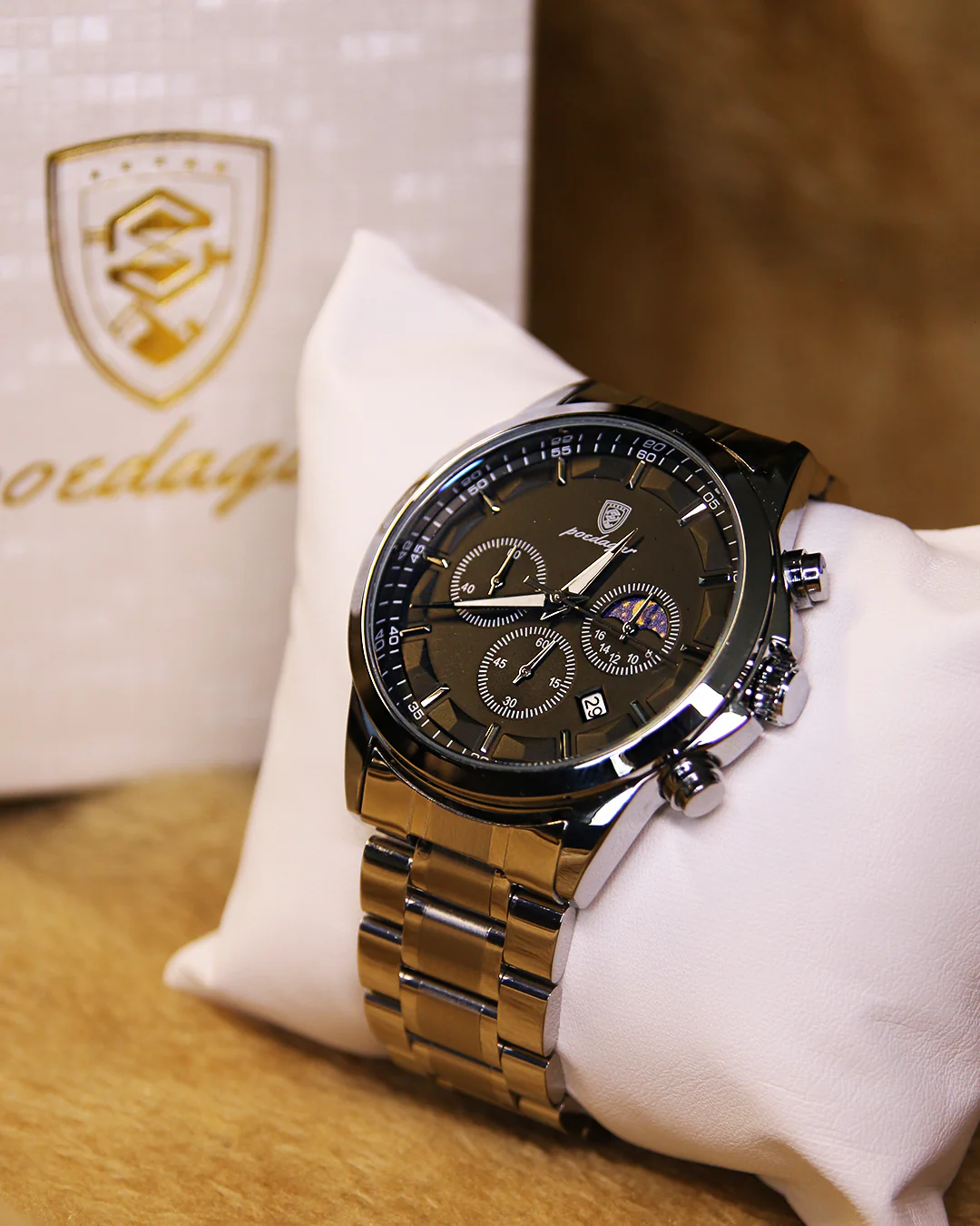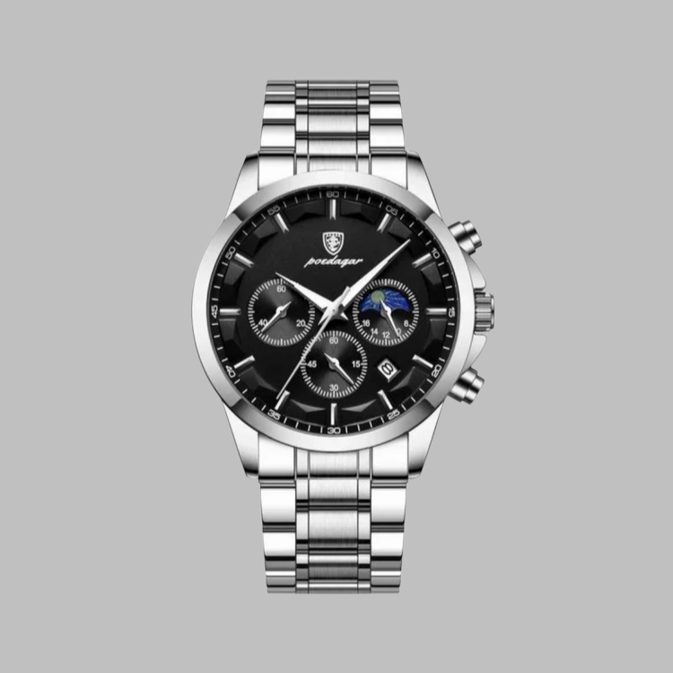 The Aether is crafted for those who believe true style is timeless. With its bold black dial, stainless steel bracelet, and multi-function chronograph design, it radiates confidence and sophistication.